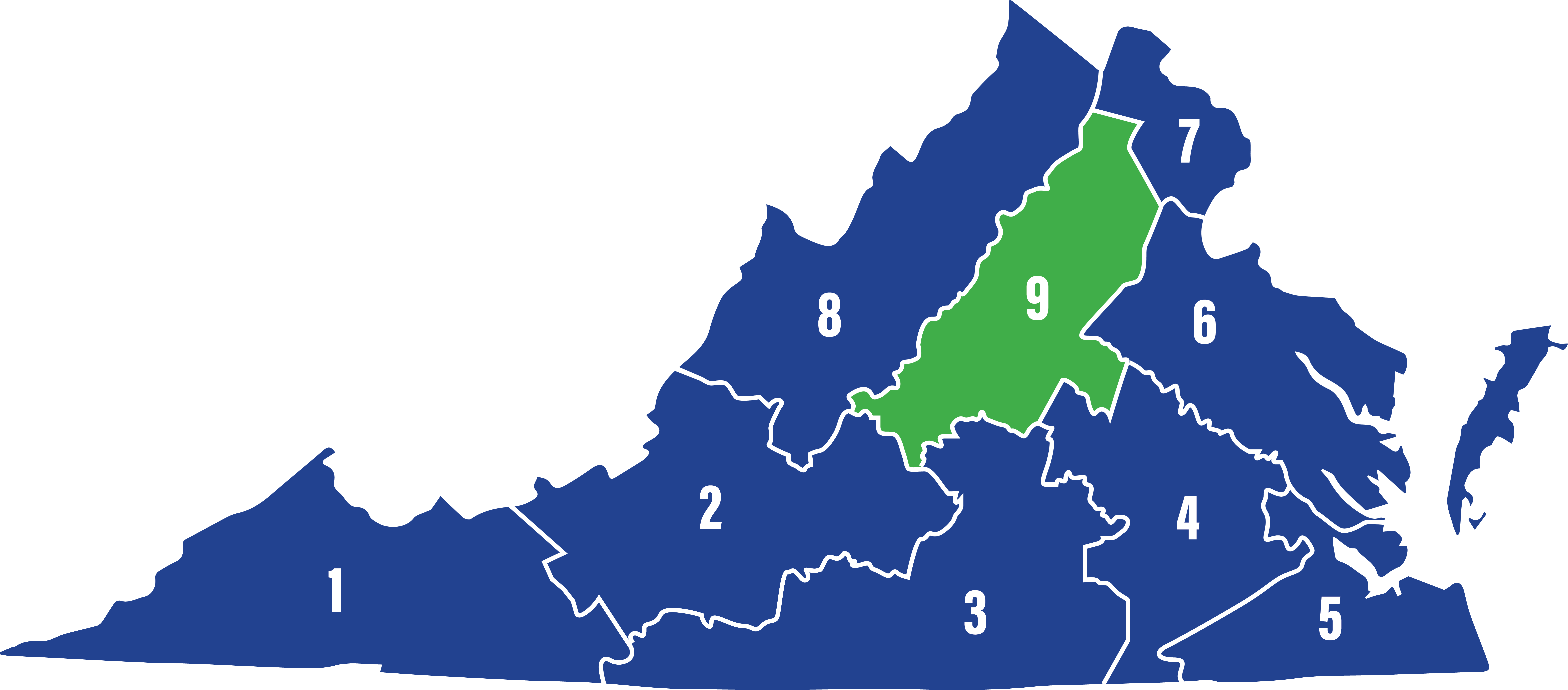 9지역에는 앨버말, 컬퍼, 포키어, 플루바나, 그린, 루이자, 매디슨, 넬슨, 오렌지, 라파해녹 카운티와 샬러츠빌 시가 포함됩니다.