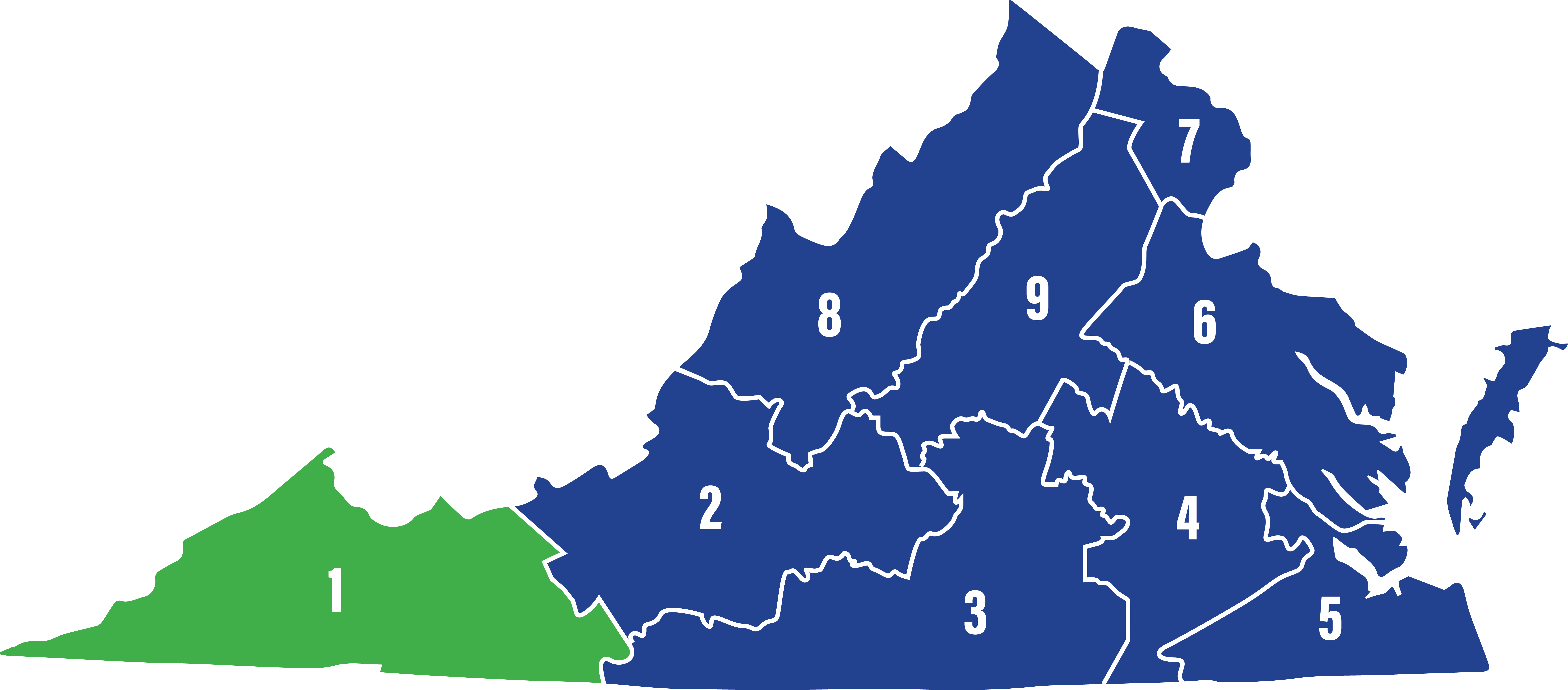 지역 1에는 블랜드, 뷰캐넌, 캐롤, 디킨슨, 그레이슨, 리, 러셀, 스콧, 스미스, 타즈웰, 워싱턴, 와이즈, 와이스 카운티와 브리스톨, 갤럭스, 노턴 시가 포함됩니다. 애팔래치아 산맥은 이 지역을 구성하는 많은 13 카운티와 3개 도시를 관통합니다.
