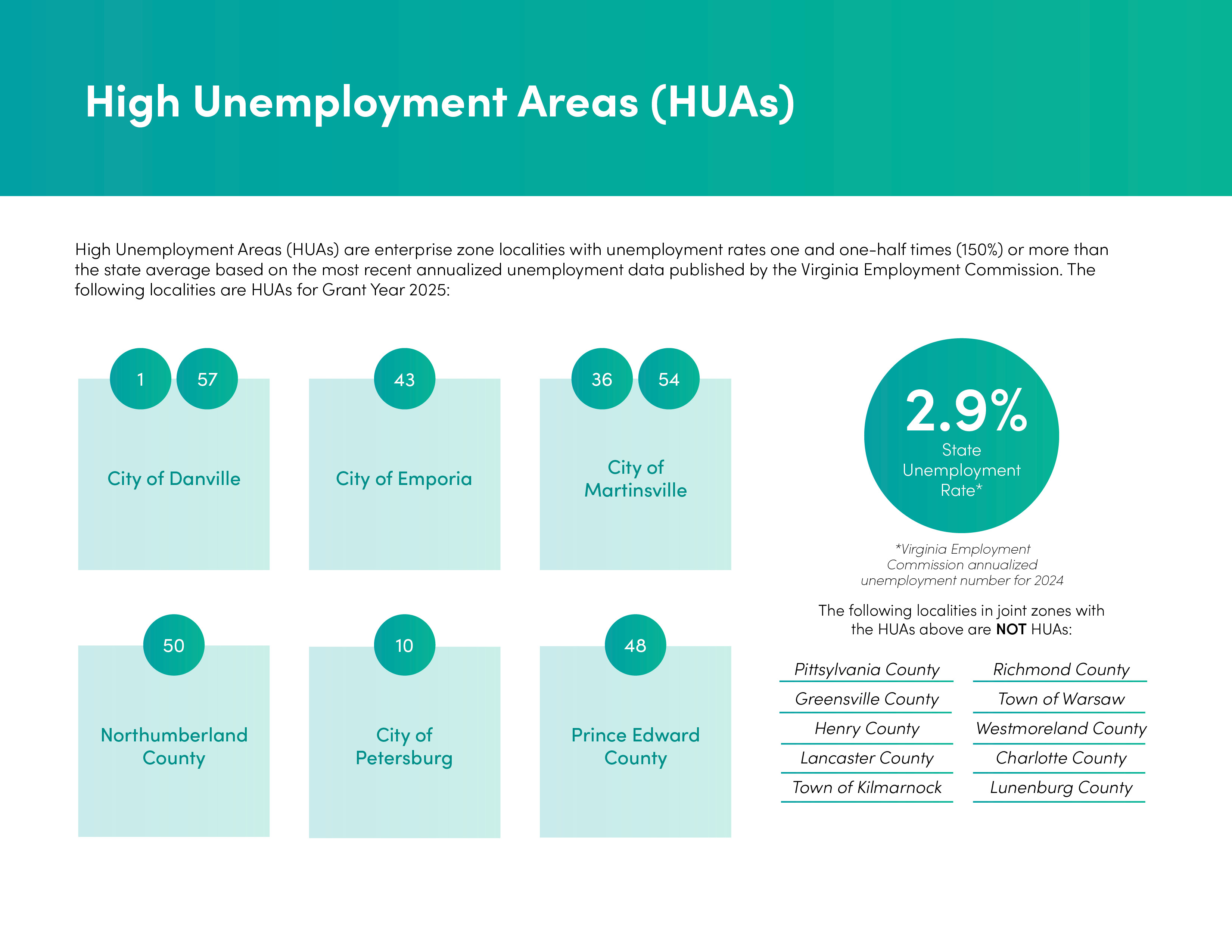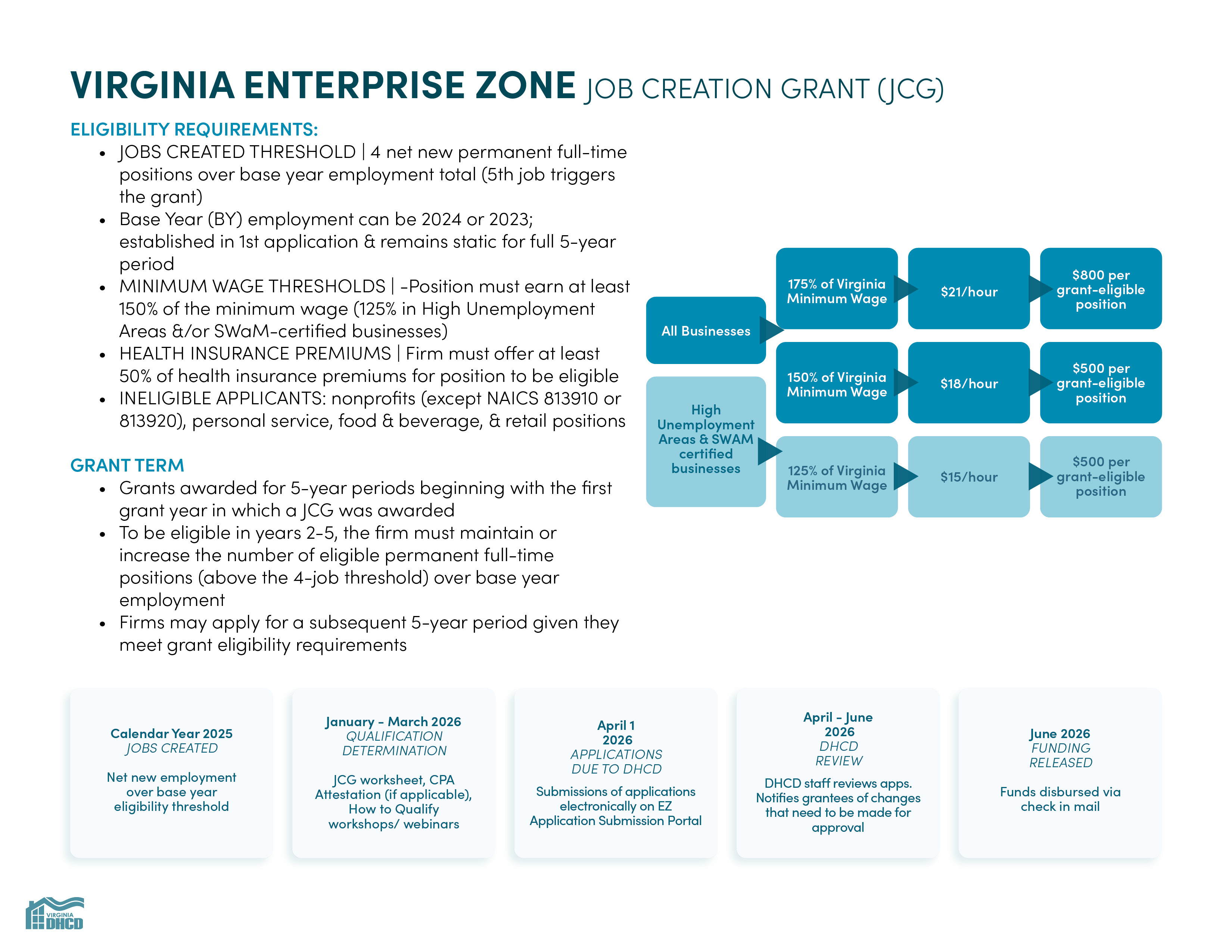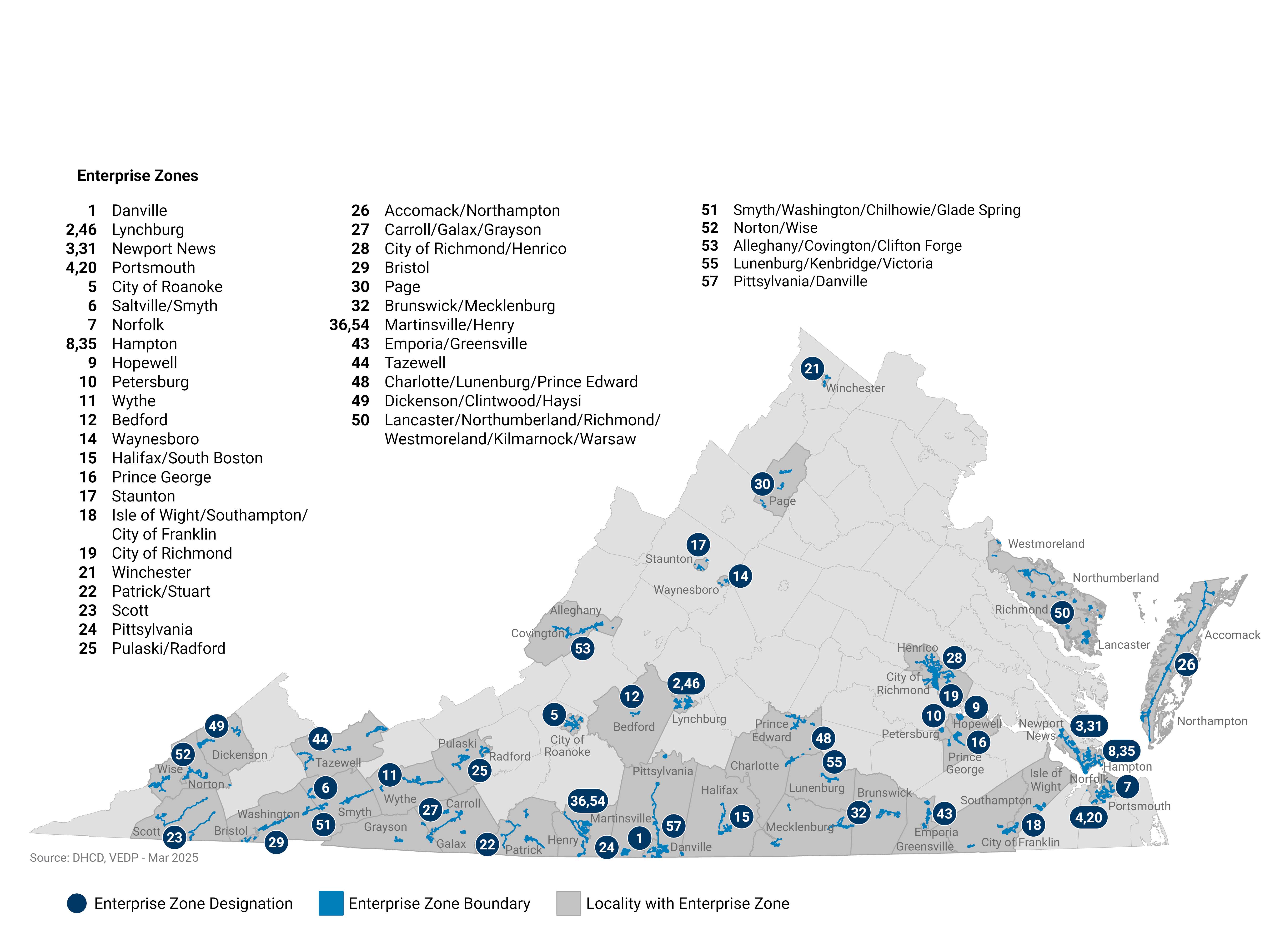 버지니아(Virginia) 기업 구역(VEZ) 프로그램은 주 정부와 지방 정부가 협력하여 일자리 창출과 민간 투자를 촉진하는 협력 프로그램입니다. VEZ는 주 전역에 기업 특구(Enterprise Zones)를 지정하고, 해당 특구 내 자격을 갖춘 투자자 및 일자리 창출자에게 두 가지 보조금 기반 인센티브인 일자리 창출 보조금(JCG)과 부동산 투자 보조금(RPIG)을 제공함으로써 이를 달성합니다. 한편, 해당 지역은 지역별 인센티브를 제공합니다.